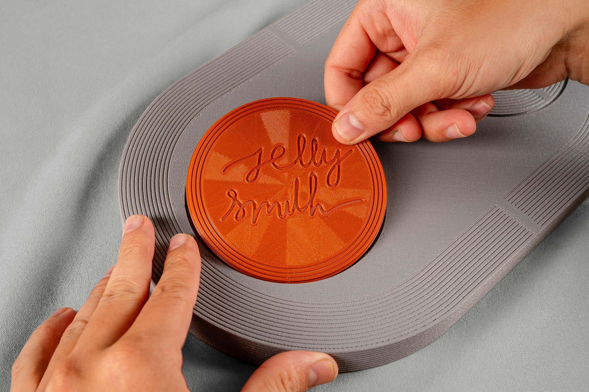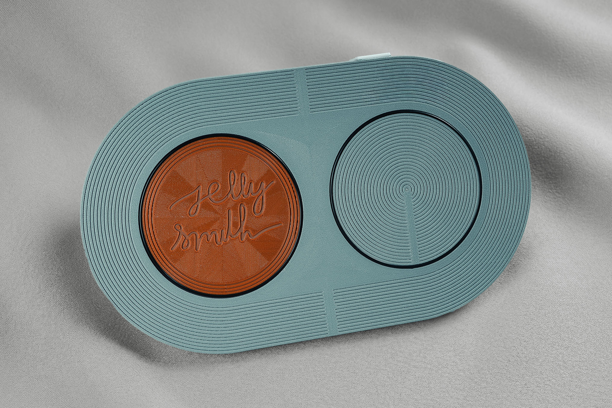 Six precision-fitted components, bonded together into what feels like a single object. Three plates form the tray body. Three additional elements lock everything from underneath, including the Jelly Smith logo disc on the base. Every part is produced in glass-fiber-reinforced PETG, chosen for its rigidity, surface texture, and durability.