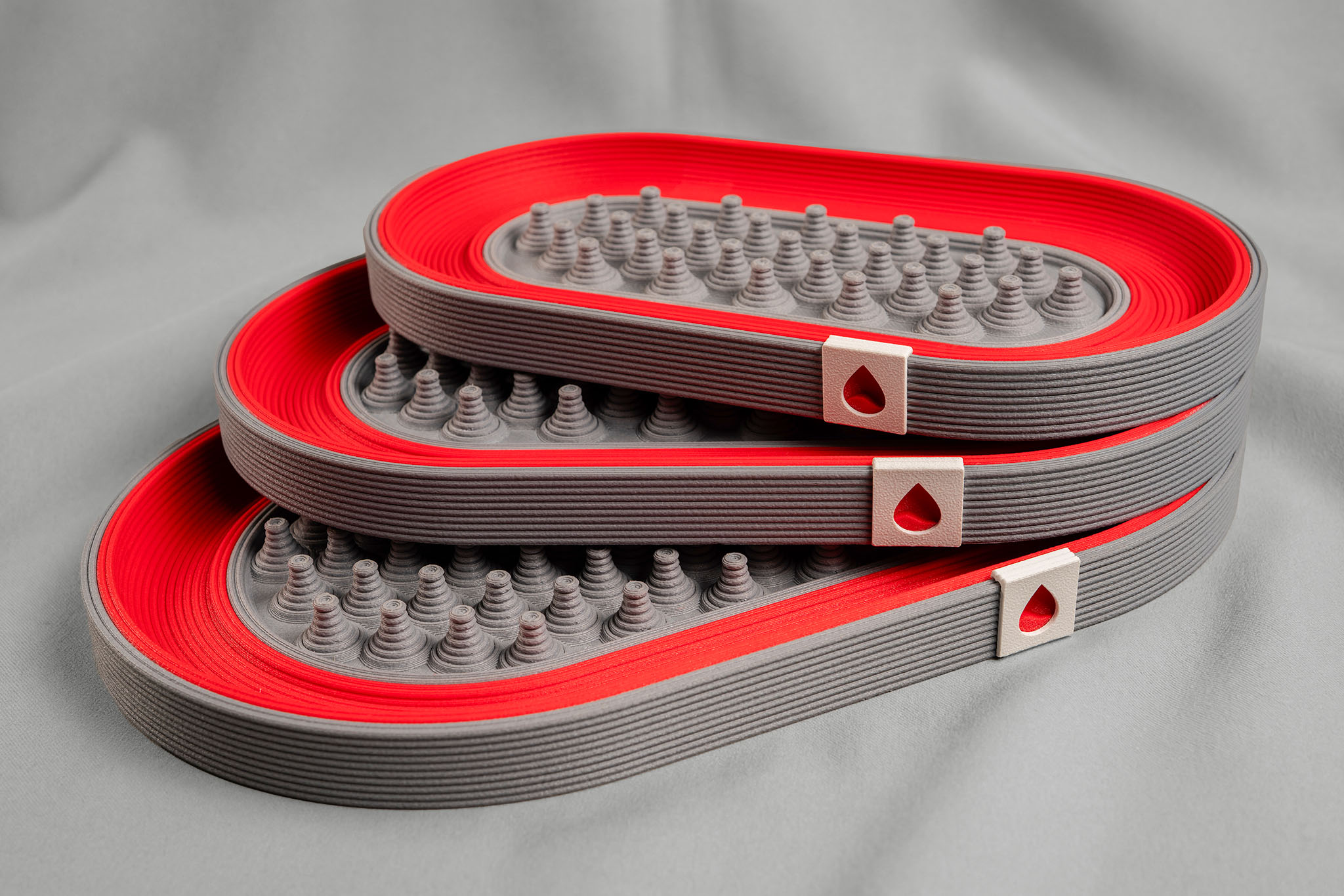 Three plates nest into one another to form the tray. On the underside, a single brown disc pins the outer and middle plates together. The logo piece and the droplet emblem secure the remaining edges. Everything is permanently bonded into one solid, seamless body.