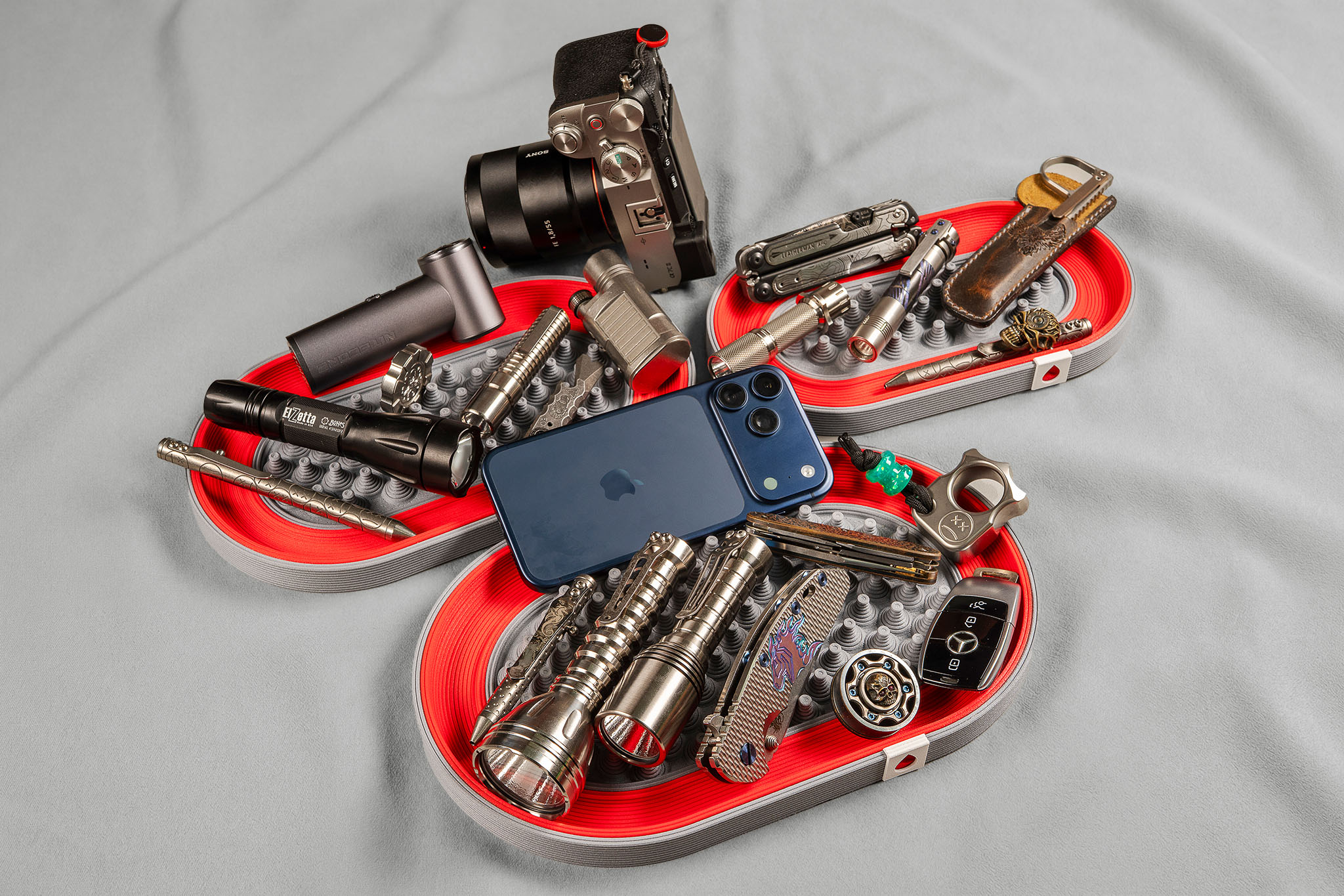 The layout borrows from stadium architecture. Concentric zones, each with a purpose. The innermost ring uses rounded pillars that guide flashlights, knives, and pens into grooves where they naturally settle. Nothing rolls. Nothing tips. The middle zone opens up for a phone, car keys, or larger flashlights. The outer ring acts as a protective frame, reinforcing the structure and adding rigidity.